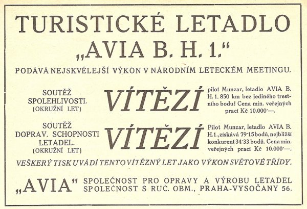 „Letoun Avia BH-1 byl v roce 1920, na První československé mezinárodní letecké výstavě, oceněn dokonce prezidentem republiky T. G. Masarykem finančním darem 100 000 korun. Díky daru a následné státní zakázce na výrobu vojenských letounů, společnost Avia nezanikla,“ říká Marcel Sezemský.